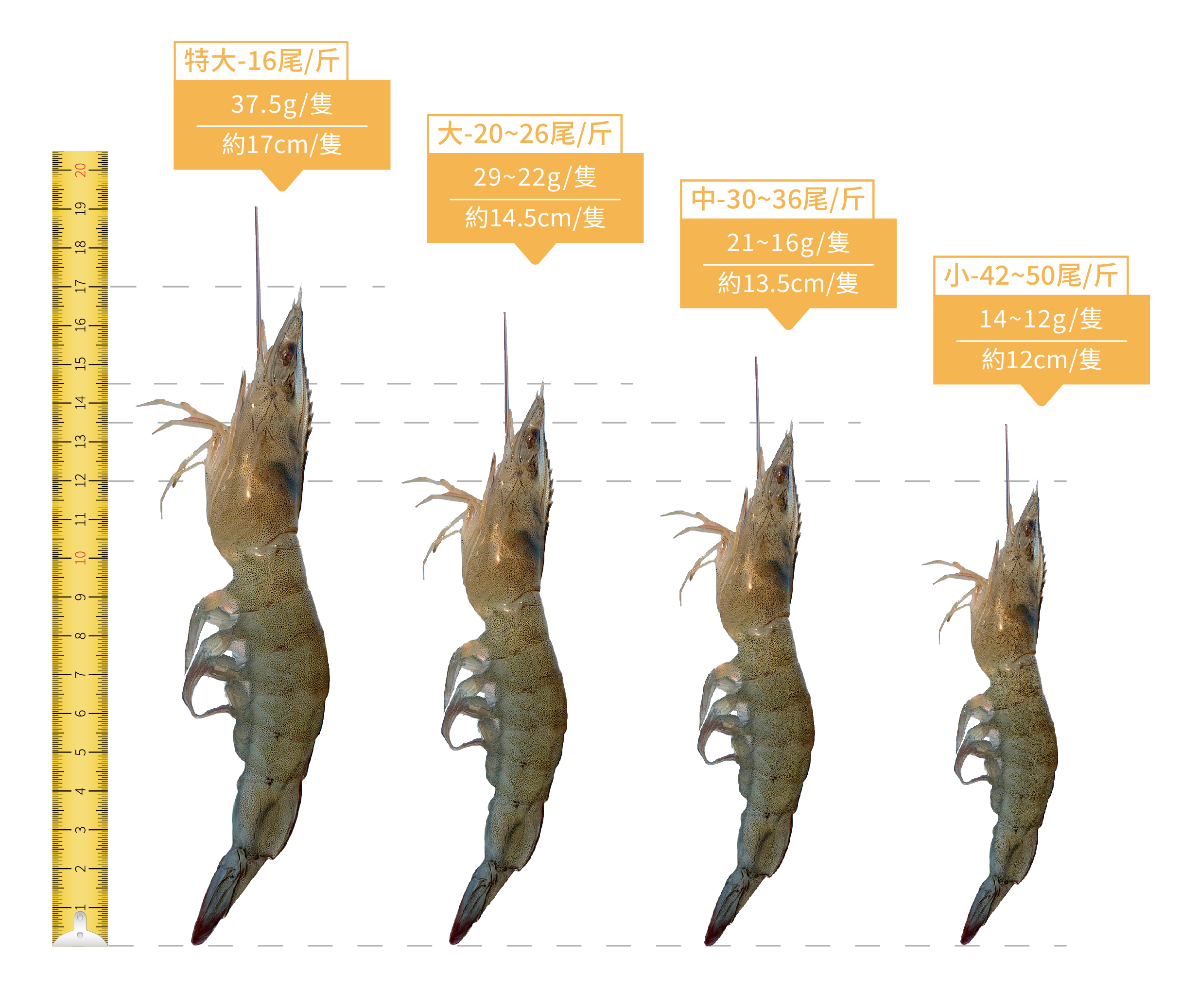 買蝦時第一個疑惑就是「尾斤」,蝦子無論在產地或市場,都是用「尾斤」當作大小的判斷,也就是「幾尾一斤(600g)」,尾斤數愈少,蝦子愈大。