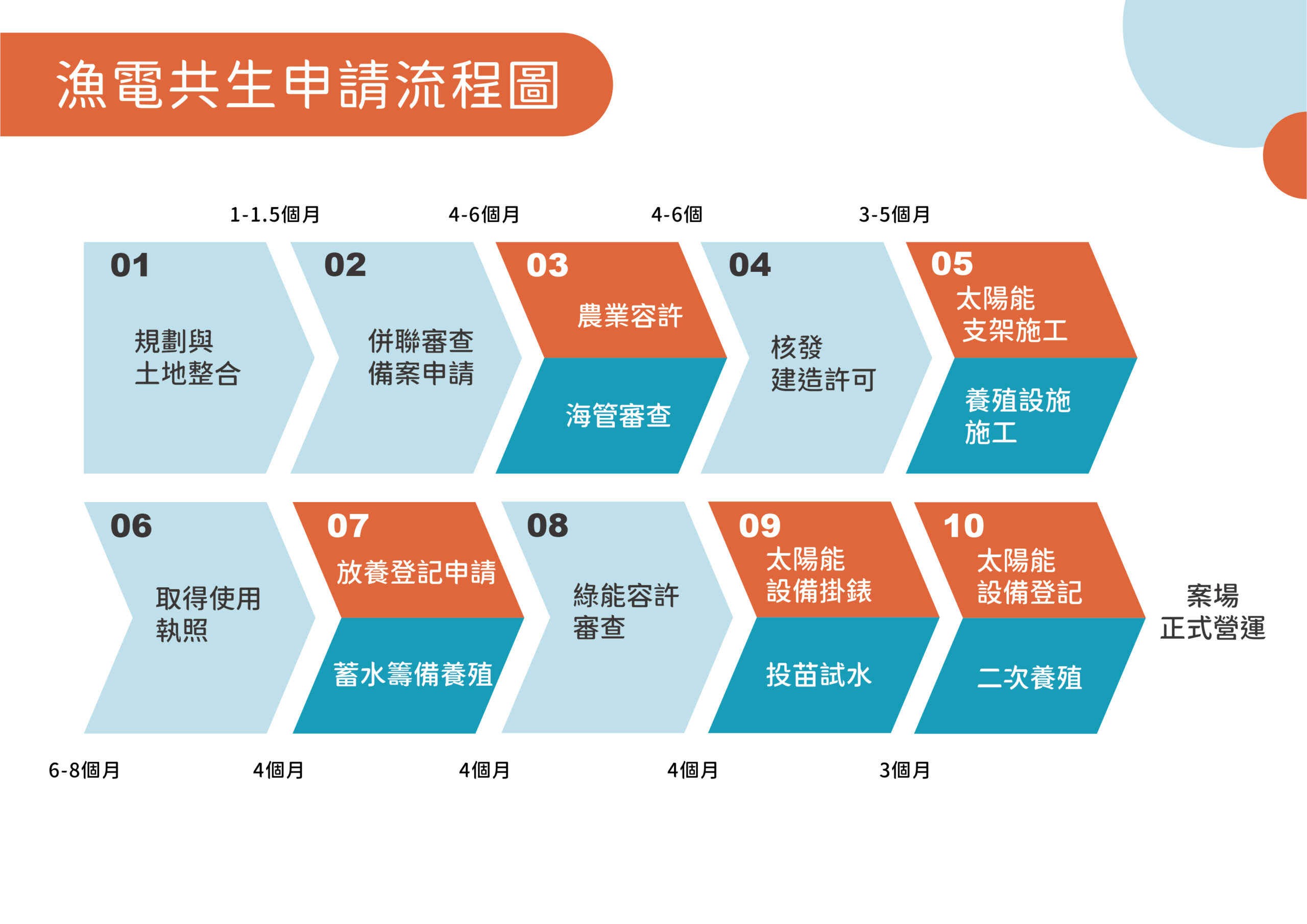 根據流程圖,漁電共生申請約分為十個階段,概略時間如下: