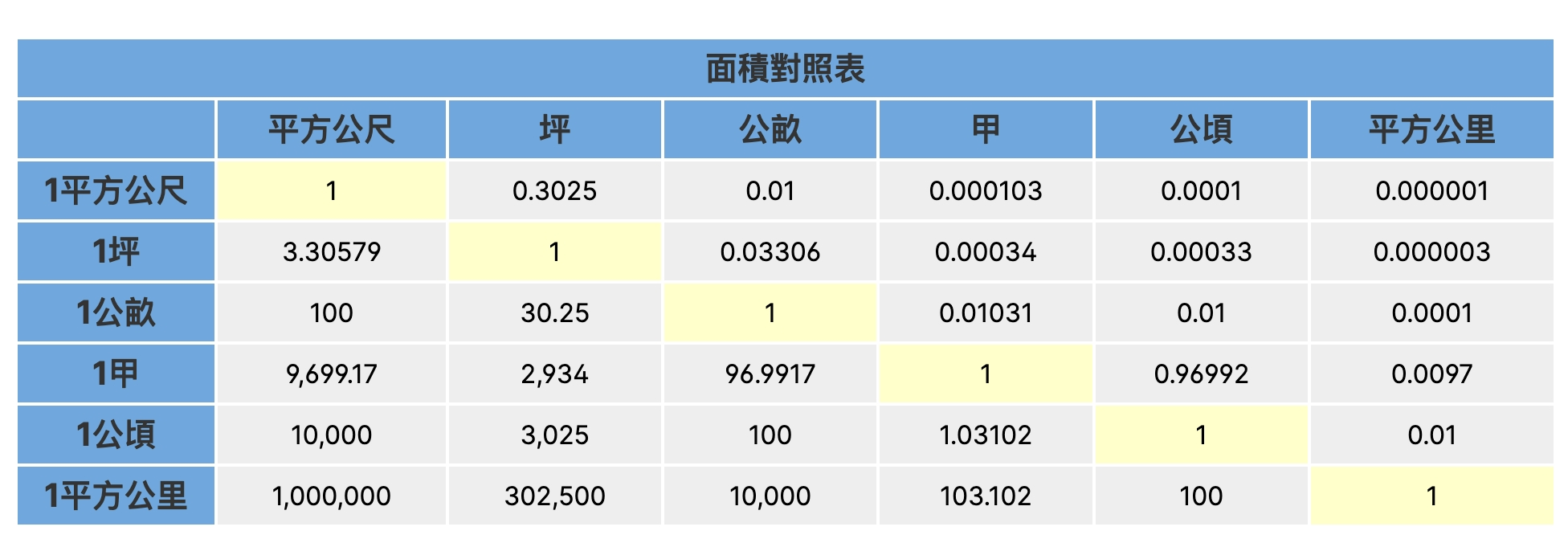 在台灣的農漁牧中「甲」是很常見的面積單位,1甲 = 2934 坪 = 0.96992 公頃 = 9,699.17 平方公尺,為了方便記憶坊間都採一萬平方公尺、大約三千坪或1公頃為一甲為概念,在早期的農業社會多以「甲」為土地買賣和持有的單位,除此之外在台灣的養殖業界為了標準化生產,與符合經濟規模,大部分的漁塭與養殖場皆是以一甲為起跳,因此是大家而熟能詳的單位。